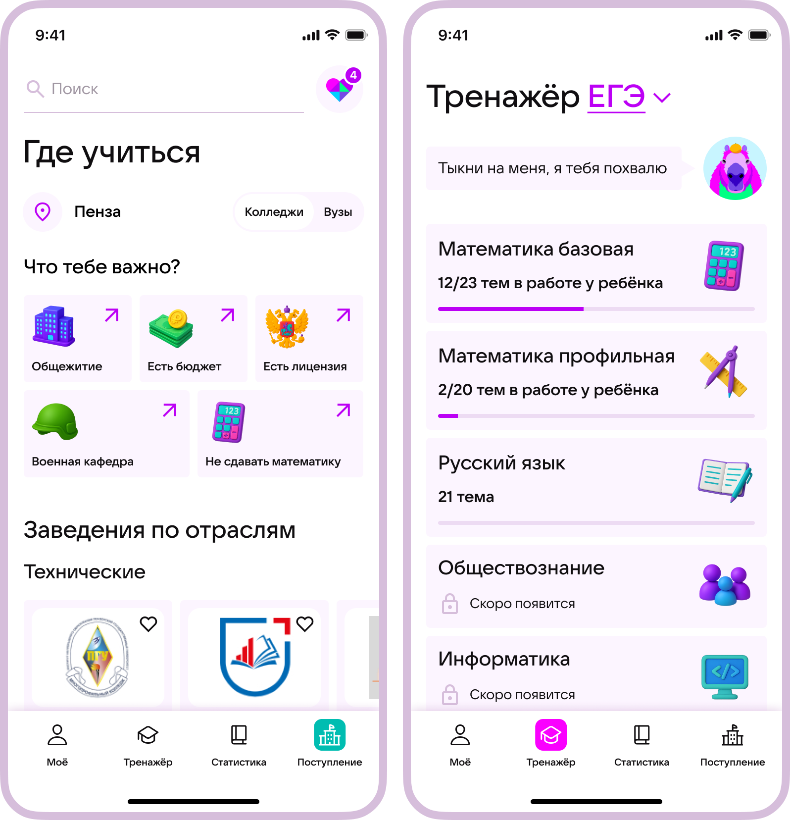 В сервисе собраны каталоги колледжей и вузов страны, реализованы возможности оценки шансов на поступление и знакомство с востребованными специальностями своего региона